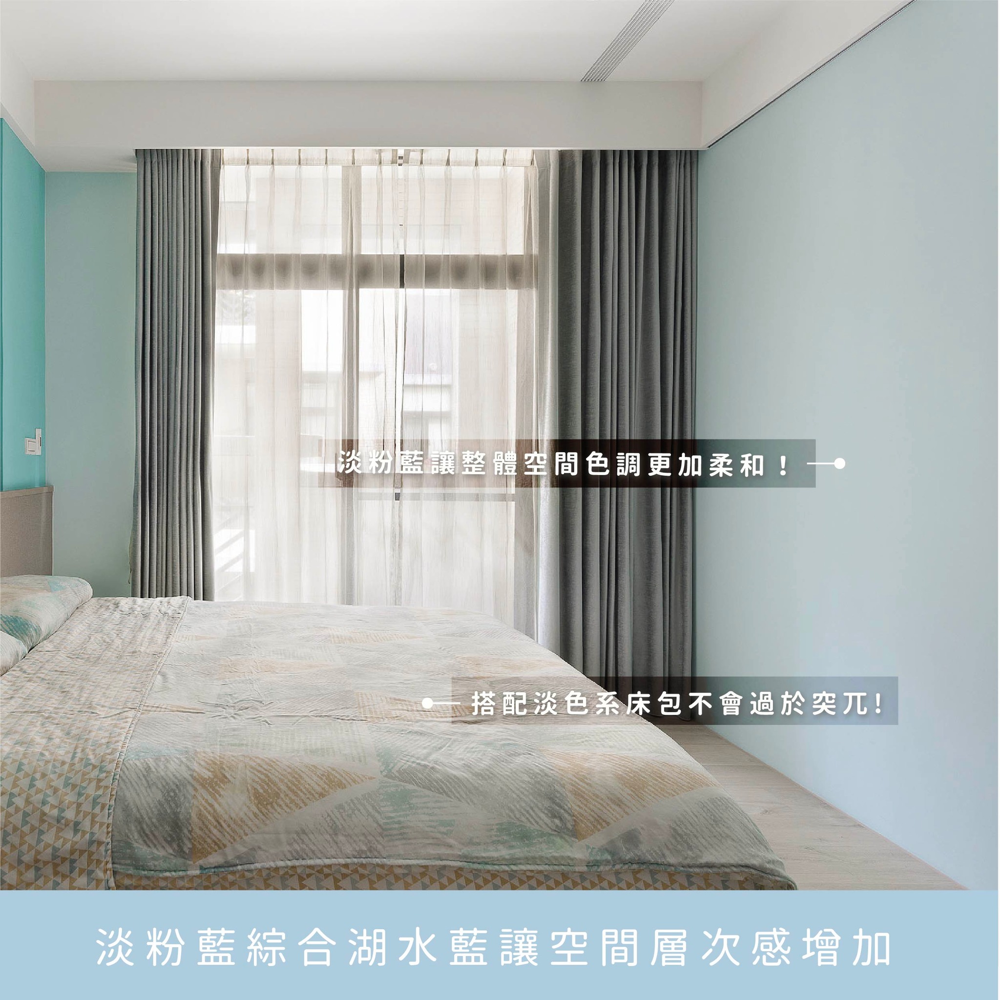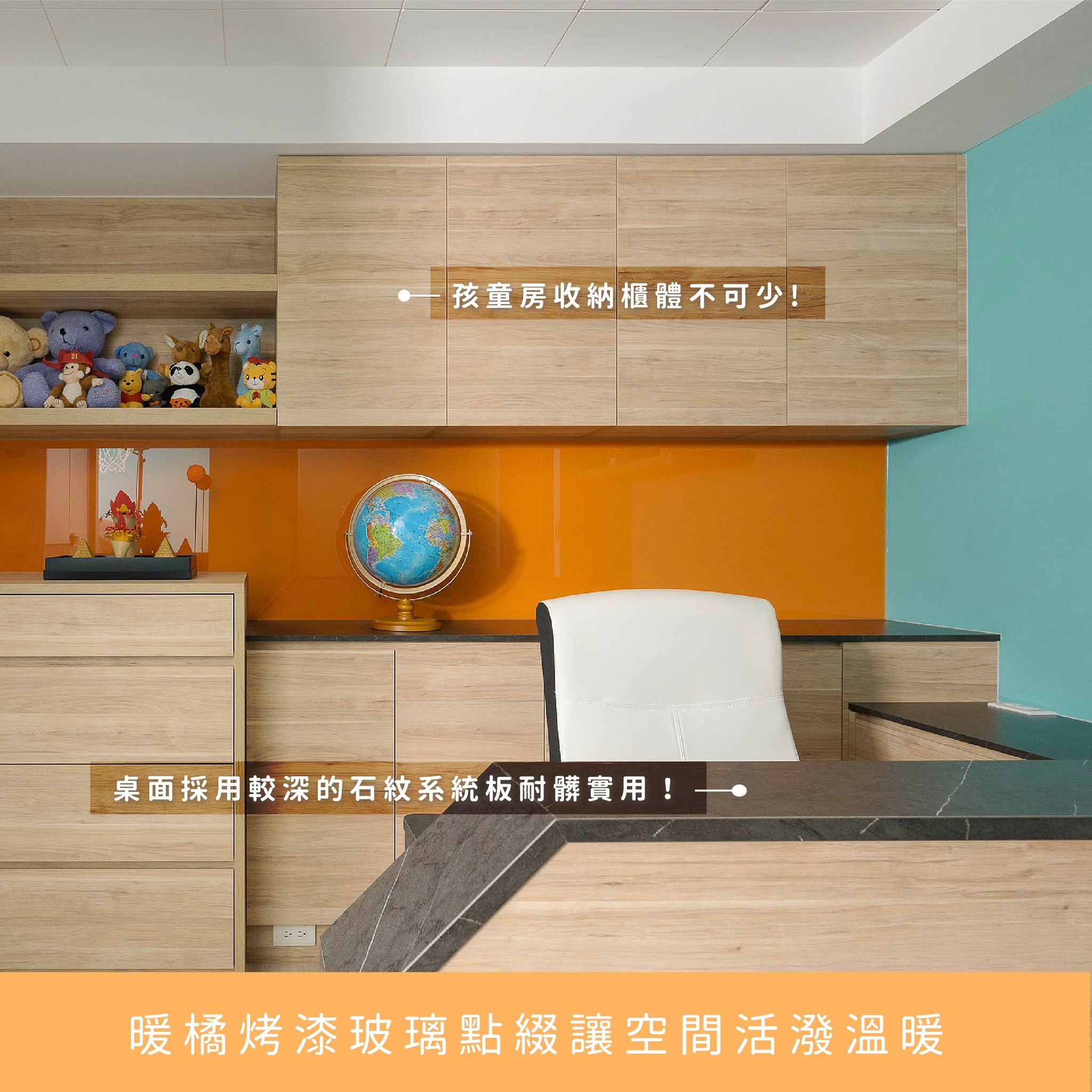 在孩童房設計裡,希望能夠藉由顏色搭配打造活力感,但卻又不會讓人感到太過鮮豔,從顏色選用湖水藍與粉藍做搭配再加入一點暖橘做搭配讓整體空間注入了陽光和藍天的意象,而在孩童房選用木質地板耐用又好清潔,收納櫃體足夠收納孩子各式各樣玩具物品及書籍,讓空間保持整潔舒適~打造一間屬於孩子的房間,讓孩子在這個空間放鬆、自在、獨處,是每個孩童心目中的小願望!