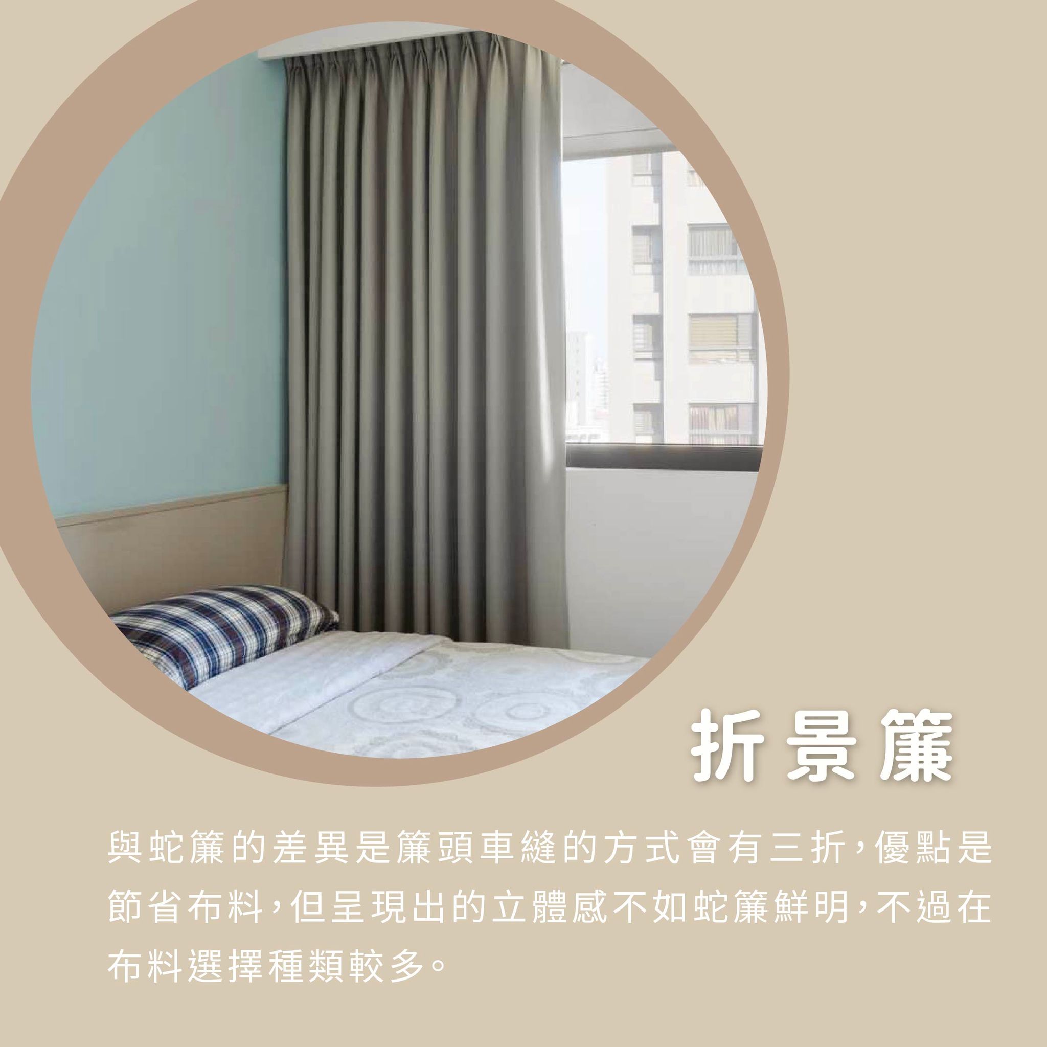 與蛇簾的差異是簾頭車縫的方式會有三折,優點是節省布料,但呈現出的立體感不如蛇簾鮮明,不過在布料選擇種類較多。