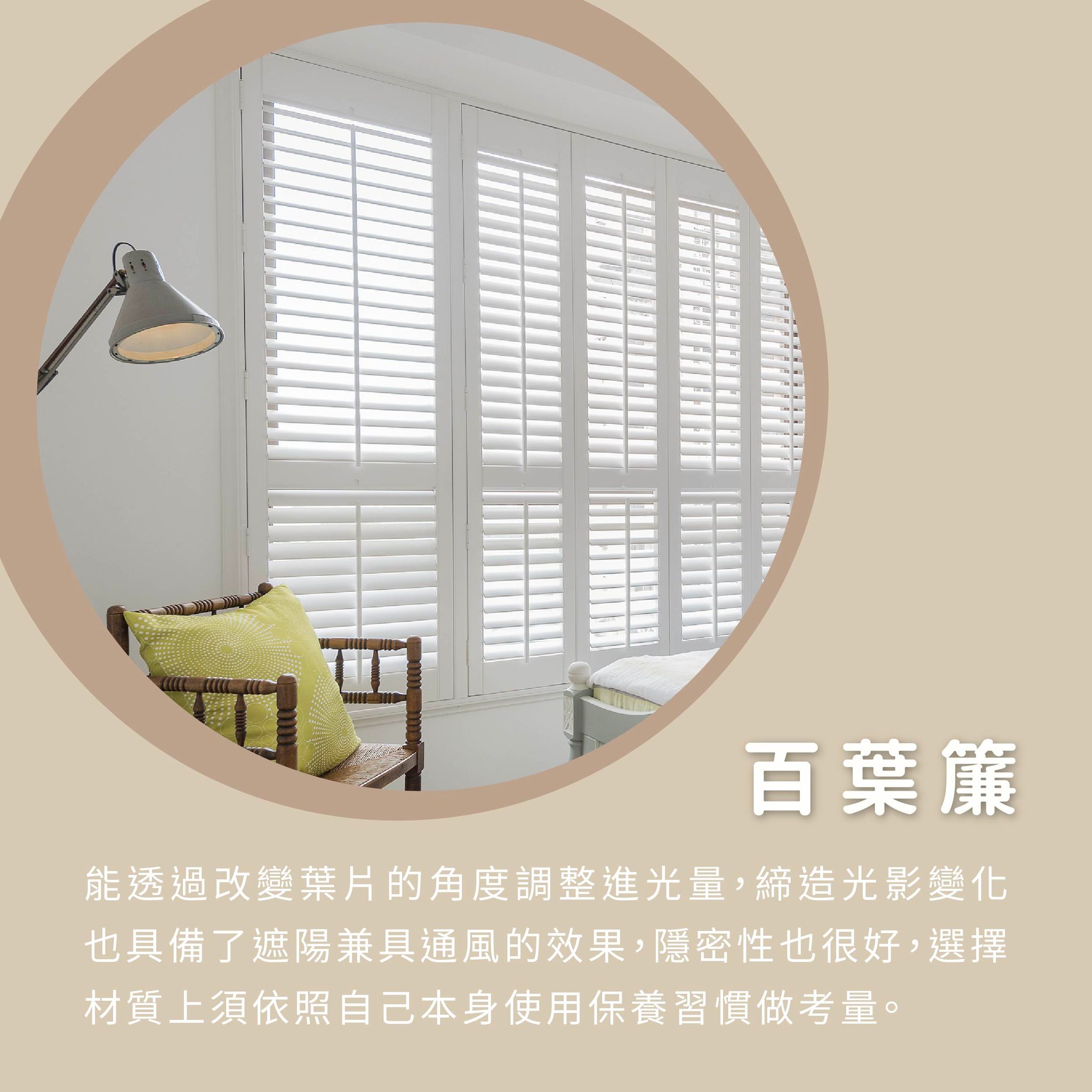 能透過改變葉片的角度調整進光量,締造光影變化也具備了遮陽兼具通風的效果,隱密性也很好,選擇材質上須依照自己本身使用保養習慣做考量。