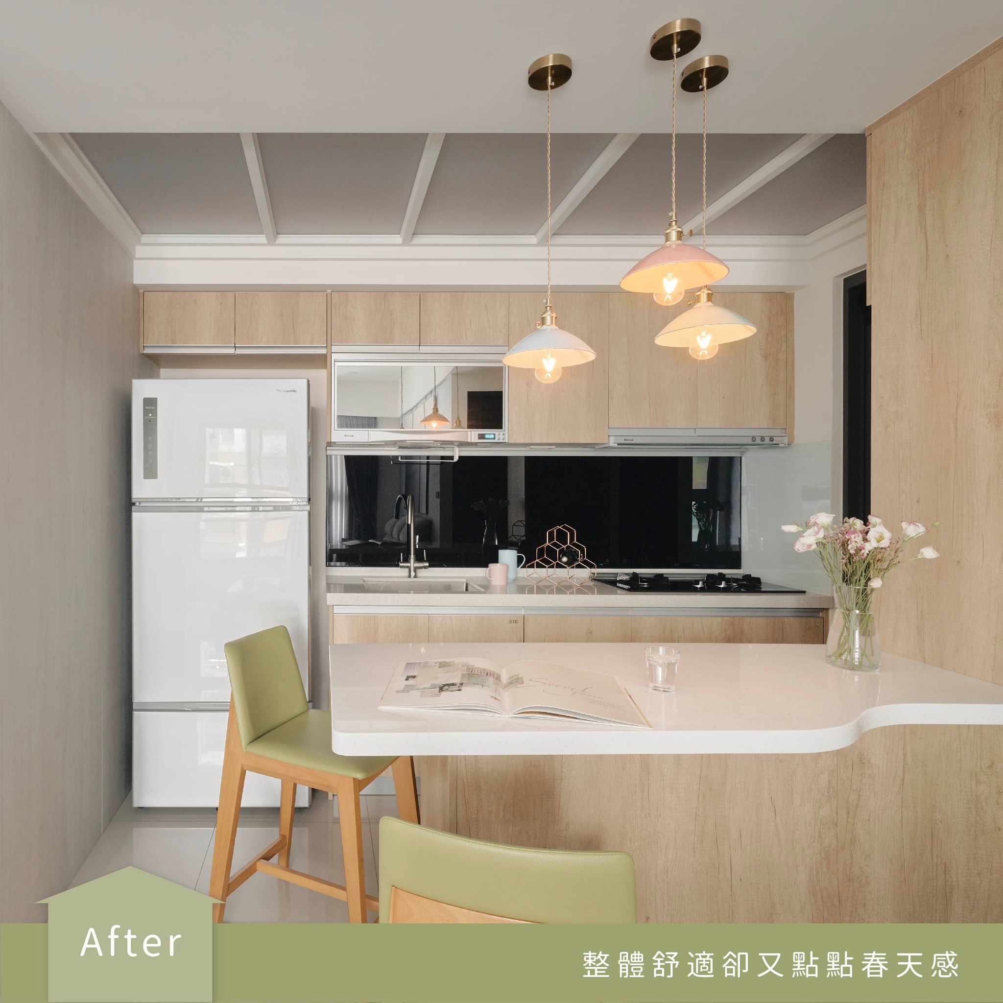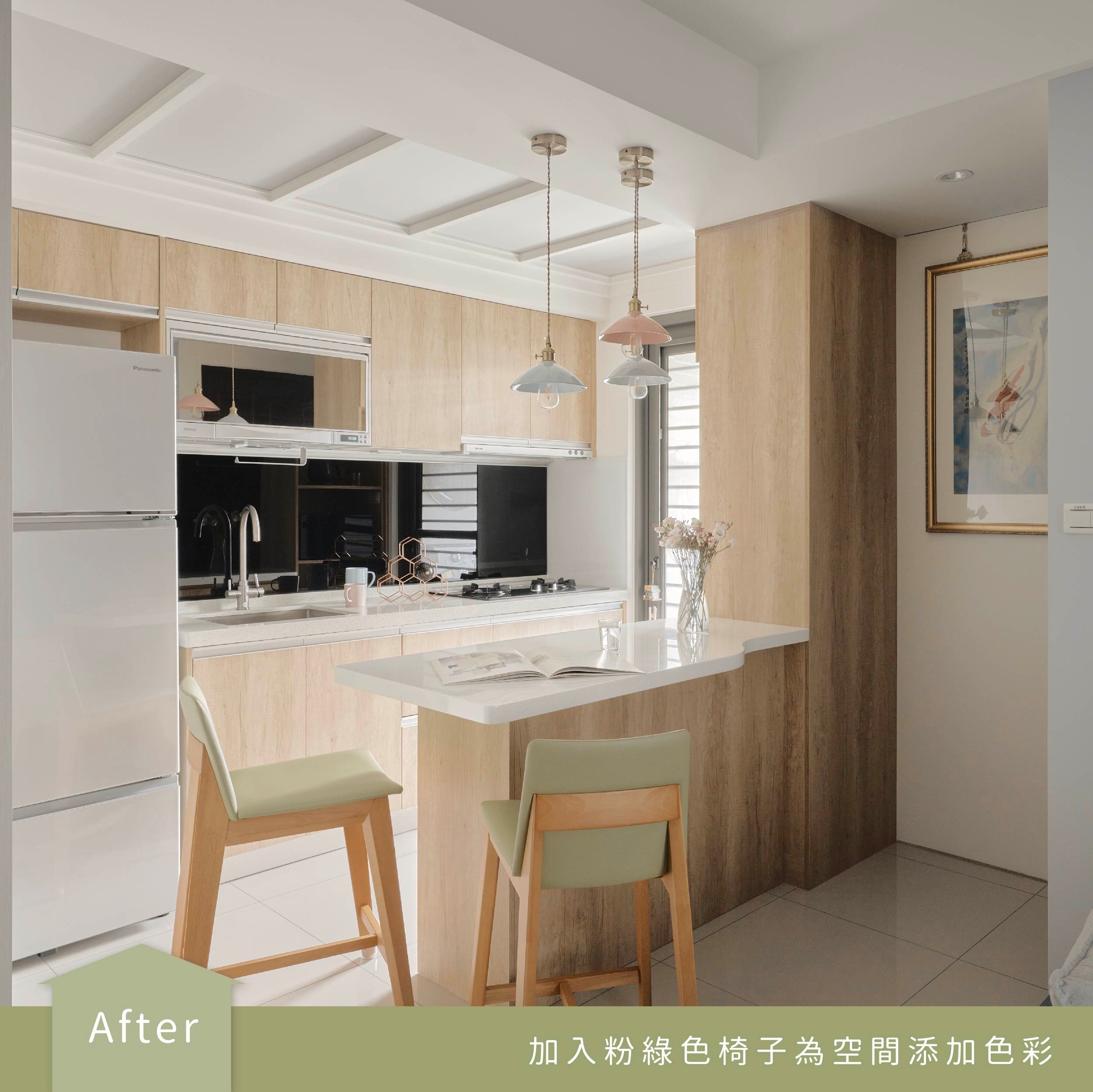 暖木色的櫃體和牆面猶如一個溫暖的擁抱搭配純白色為空間增添明亮與寬敞的質感。粉綠色的椅子彷彿春日裡剛萌芽的嫩葉,活潑又充滿生機;而粉色吊燈則如同天空中柔和的雲彩,為整個空間增添了一絲浪漫與優雅。